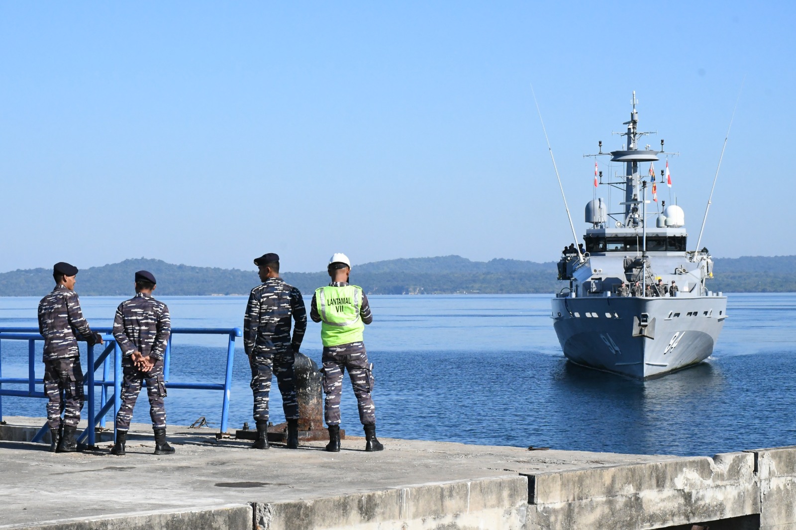 Kapal Perang Australia HMAS Launceston III (P94) yang tiba di dermaga Mako Lantamal VII Kupang pagi ini dikomandani oleh LC Andrian Hiks dan disambut hangat dengan pengalungan kain adat oleh Wakil Komandan (Wadan) Lantamal VII Kolonel Marinir Aris Budiadi, S.Pi., M.M, diikuti oleh PJU Lantamal VII, prajurit Lantamal VII, tim merplug Lantamal VII serta penyambutan berupa tarian khas dari Rote NTT tari Foti Lalendo yang menggambarkan sukacita dan selamat datang di bumi Flobamorata.