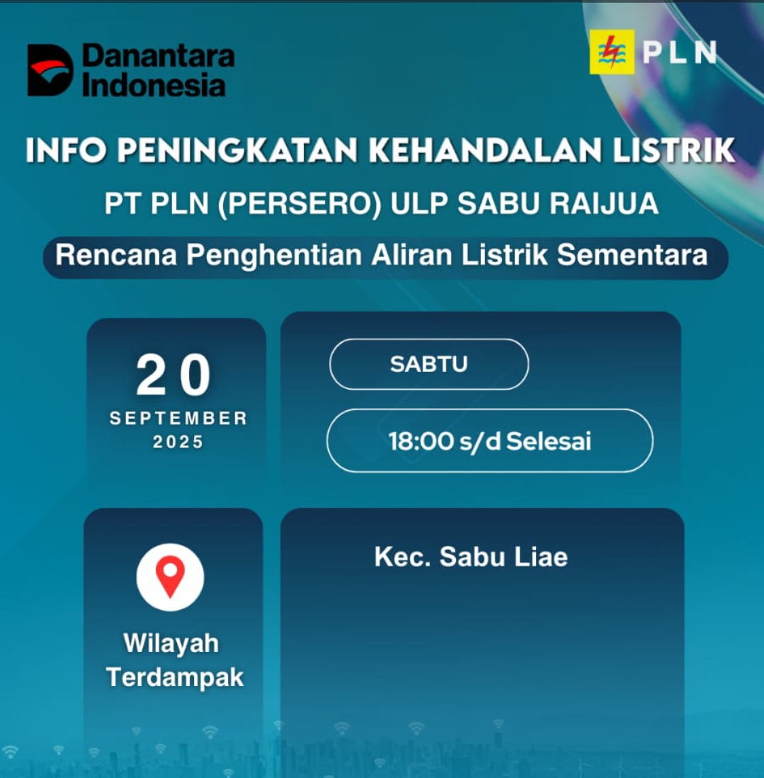 PLN mengimbau kepada pelanggan khususnya di wilayah Kecamatan Sabu Liae untuk mengantisipasi kemungkinan pemadaman dengan menyiapkan genset cadangan.