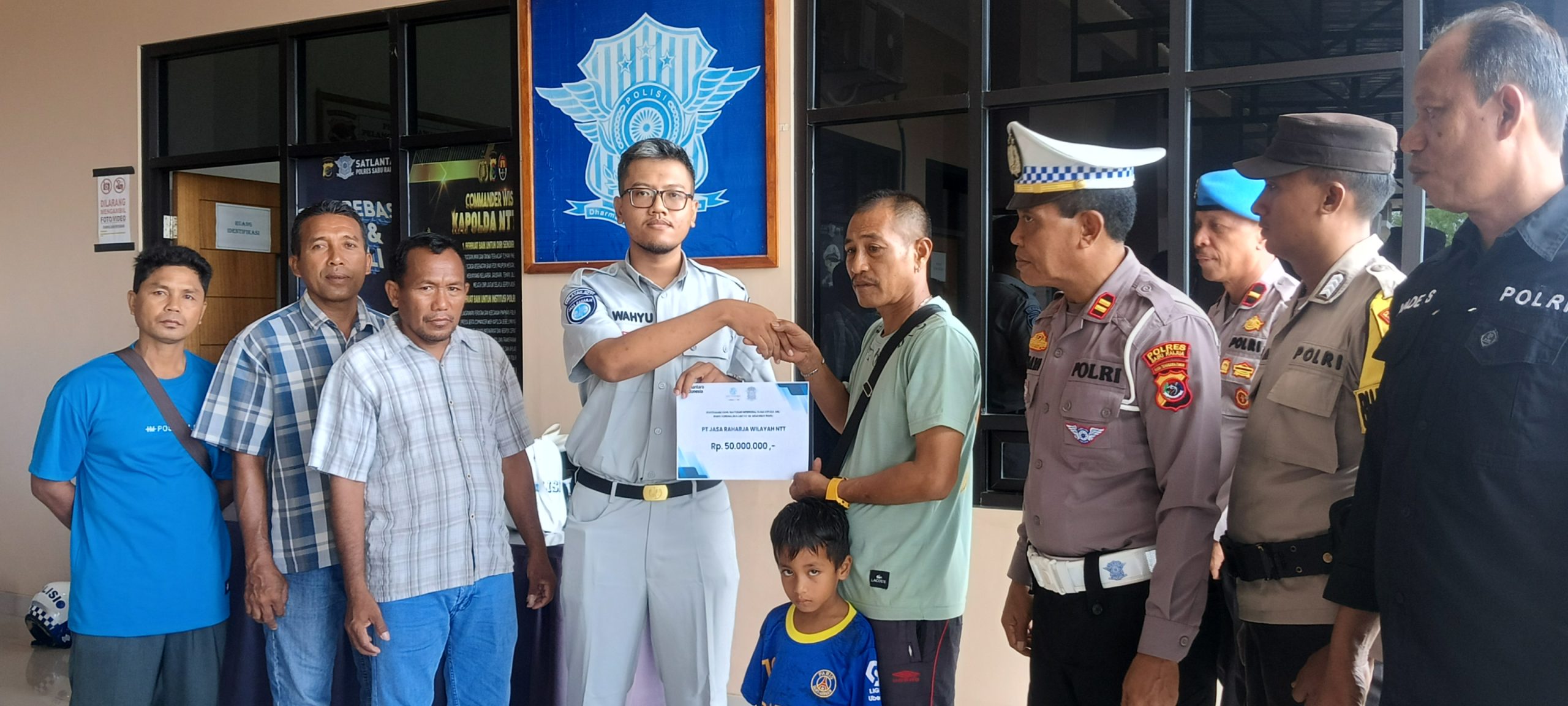 Penyerahan dilakukan di depan ruangan Satlantas Polres Sabu Raijua, disaksikan oleh aparat Desa Menia antara lain Kepala Desa dan Kepala Dusun tempat korban berdomisili, serta personel Propam dan Humas Polres. Santunan sebesar Rp50 juta diberikan kepada suami korban, Melkianus Manu, sebagai penerima hak.