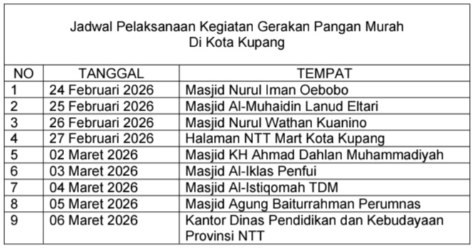 Selain melakukan Sidak ke Pasar dalam rangka menjelang Hari Besar Keagamaan Nasional Idul Fitri 2026, Bulog Kanwil NTT bekerja sama dengan Dinas Peridustrian dan Perdagangan Provinsi Nusa Tenggara Timur menggelar kegiatan Gerakan Pangan Murah yang dilaksanakan di beberapa lokasi dalam wilayah Kota Kupang.