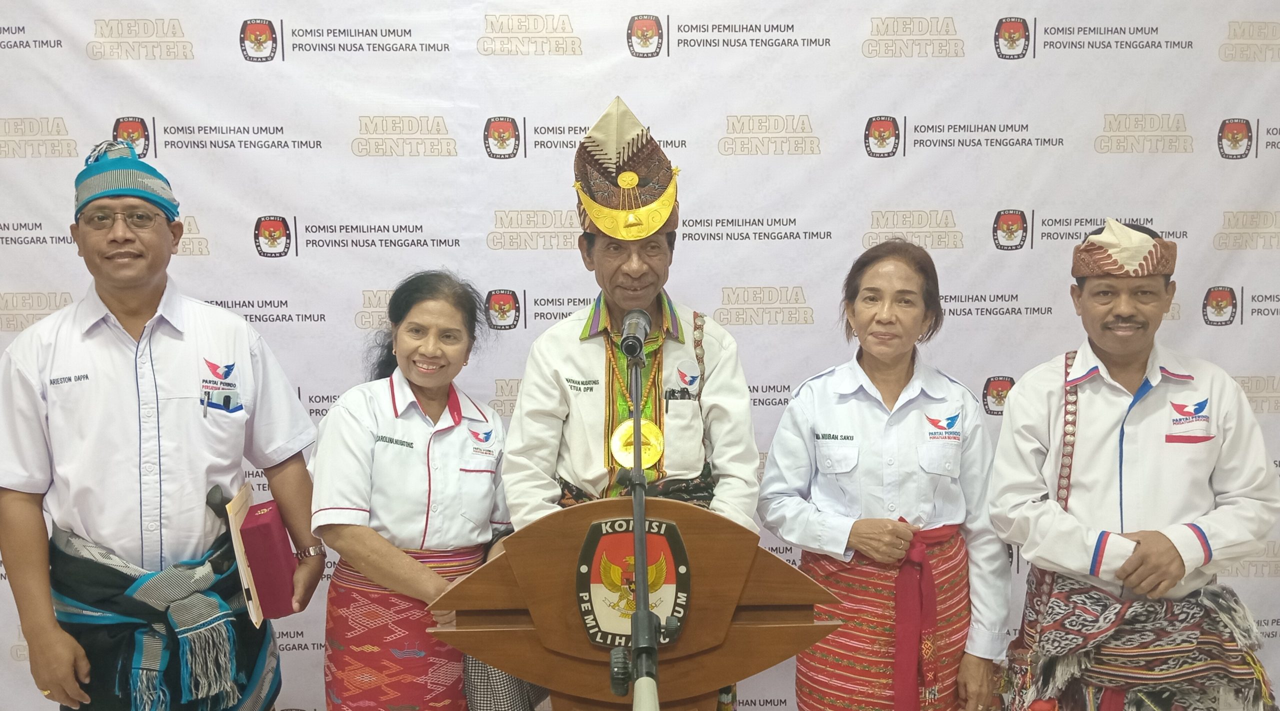 Ketua DPW Perindo NTT, Jonathan Nubatonis bersama Pengurus DPW Perindo saat memberikan keterangan Pers usai mendaftar para Bacaleg di KPU NTT, Sabtu (13/05/2023)